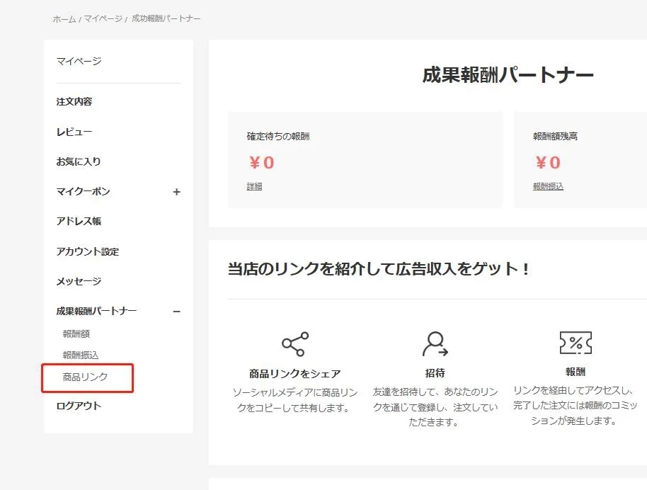 5:「成果報酬パートナー」中で、お客様の「報酬額」、「報酬振込」、「商品リンク」の操作が可能となります。
