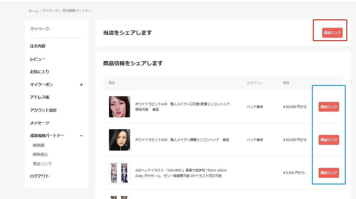 1:当店のサイトに会員登録で使用するメールアドレスを窓口「service@wrdoll.com」までご連絡していただき,成果報酬パートナーに登録させていただきます。