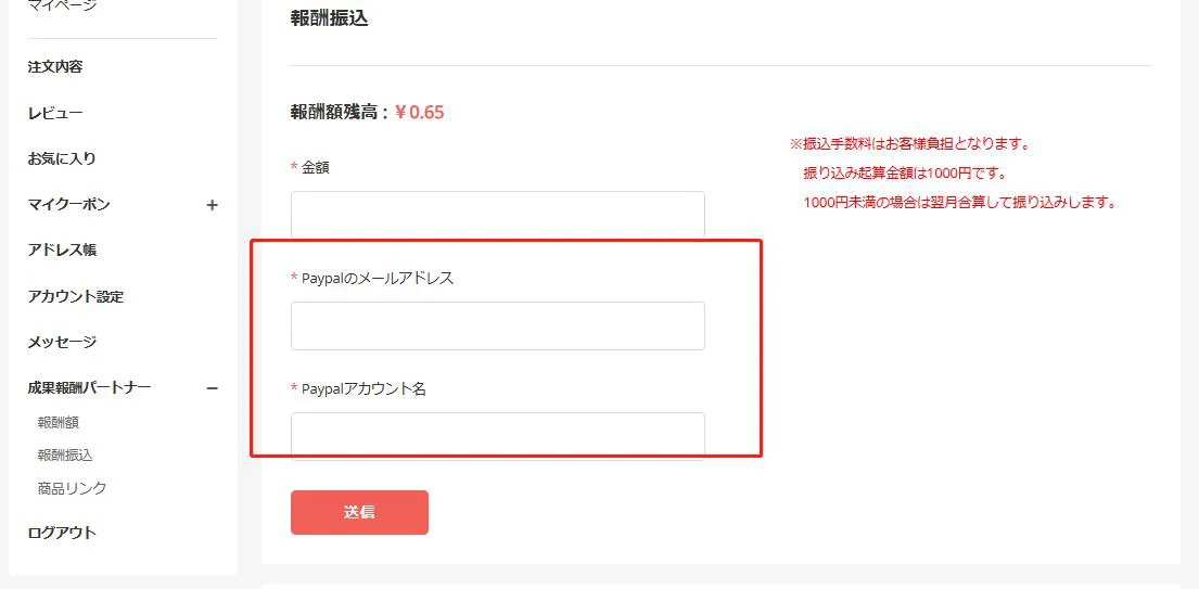 PayPalアカウント開設後、「報酬振込」をクリックし、下記画像のように、金額、PayPalのメールアドレス、PayPalアカウント名を入力していただき、振込申請ができます。申請内容の間違いなければ、翌月15日まで、お振込みさせていただきます。